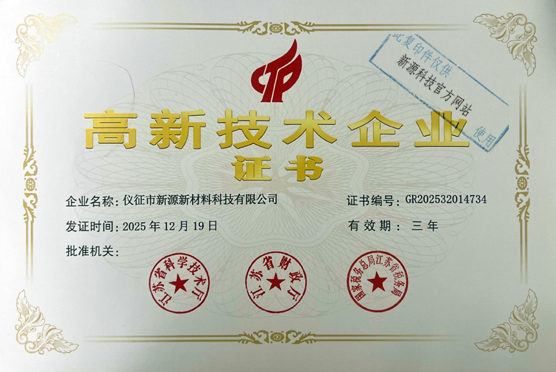 新源新材料科技通過了GB/T 19001-2016/ISO 9001:2015質量管理體系認證、GB/T 24001-2016/ISO 14001:2015環境管理體系認證和GB/T 45001-2020/ISO 45001:2018職業健康安全管理體系認證。具有技術研究和產品開發中心,20余項專利技術。“纖友牌”獲得揚州市知名商標稱號,企業獲得“儀征市先進企業”、“江蘇省民營科技企業”、“江蘇省省級高新技術企業”和江蘇省省級科技型中小企業”等稱號。